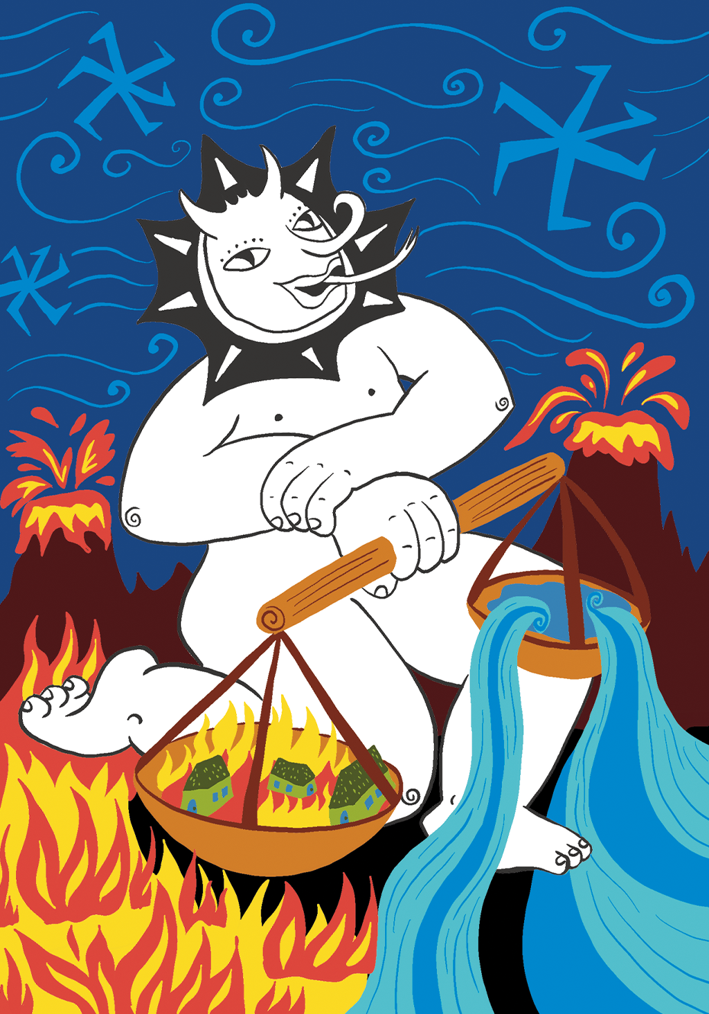 Círculo solar dividido, balanza, caminos en espiral.